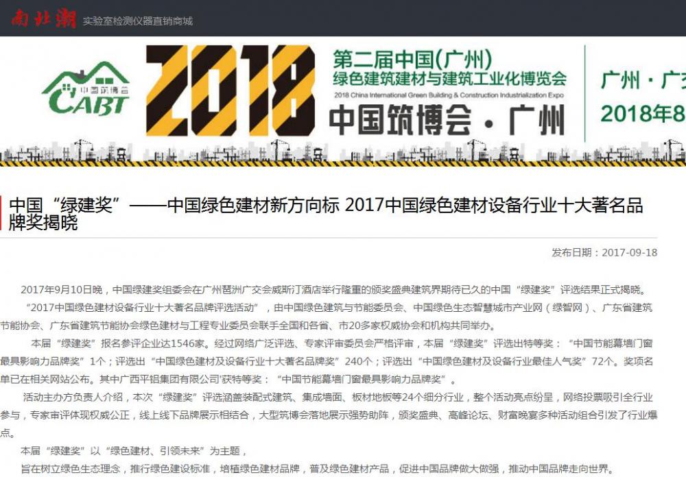 招商寶網(wǎng)發(fā)布有關(guān)2017中國(guó)綠色建材設(shè)備行業(yè)十大著名品牌獎(jiǎng)的報(bào)道 (2017-10-30)
