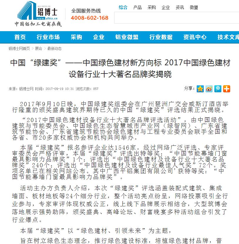 綠建之窗網(wǎng)發(fā)布有關(guān)2017中國綠色建材設(shè)備行業(yè)十大著名品牌獎(jiǎng)的報(bào)道 (2017-10-31)
